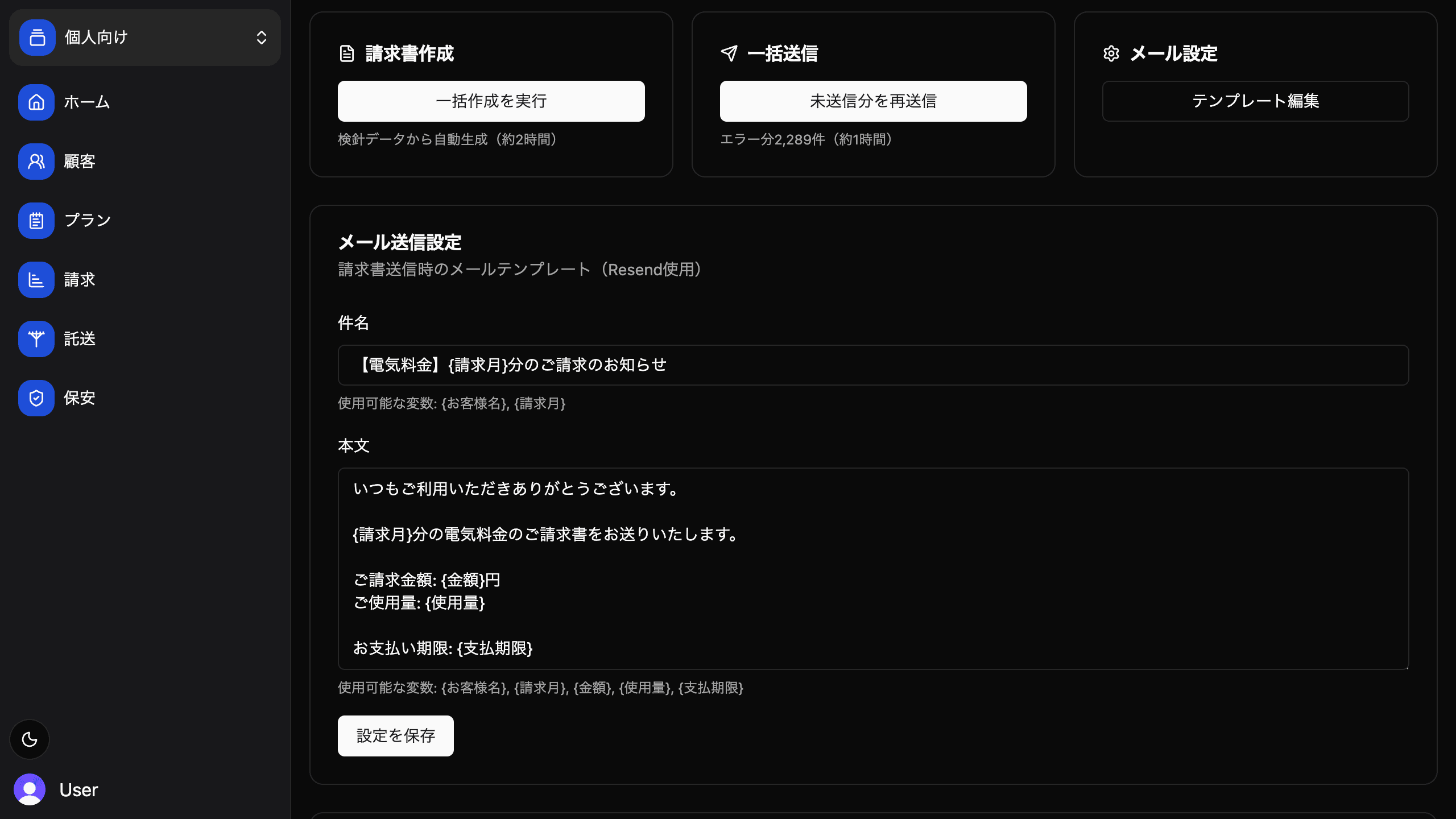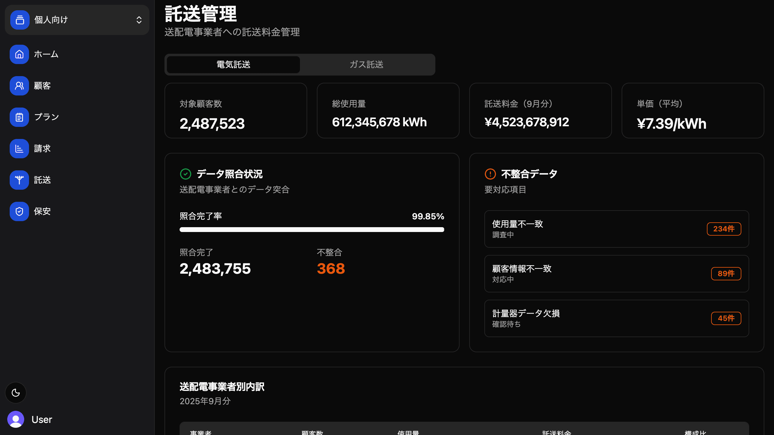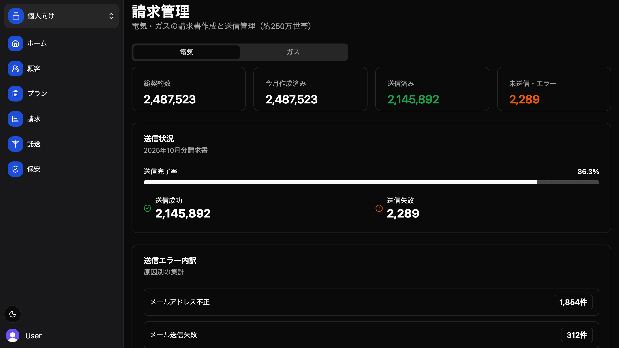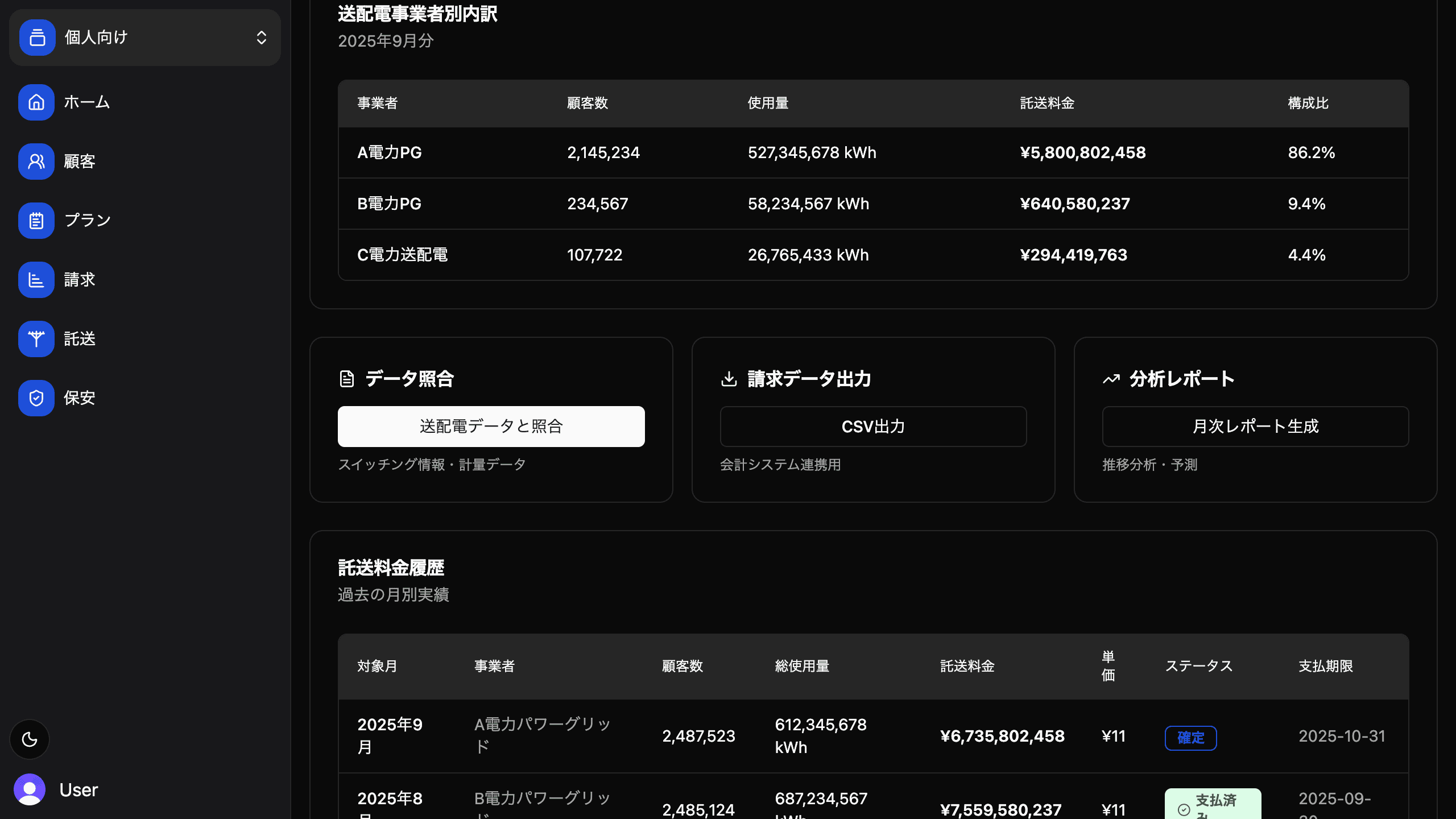 顧客情報の管理から、プラン設定、料金計算、請求処理、そして託送・保安・外部システム連携に至るまで、日々の運用をクラウド上でシームレスに統合します。
